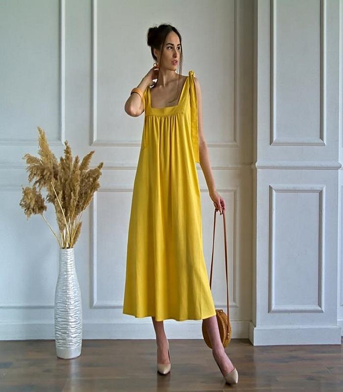 Encantador Vestido Largo Holgado Sin Mangas de Lino Amarillo Brillante con Espalda Descubierta y Tirantes Anchos, Lindo Vestido de Verano con Espalda Descubierta para Damas Modernas