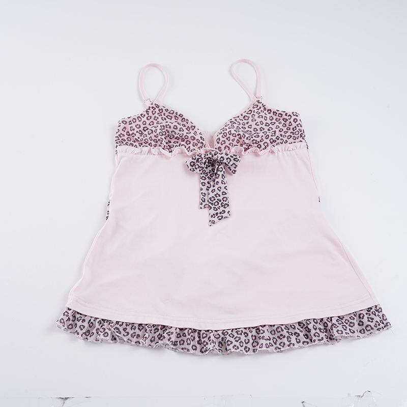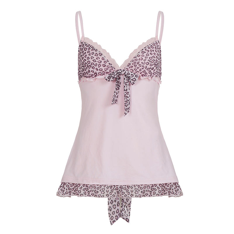 Encantador Top CAMIS de Color Sólido y Corte Ajustado con Detalle de Parches con Estampado de Leopardo, Estilo Dulce con Encaje Tejido