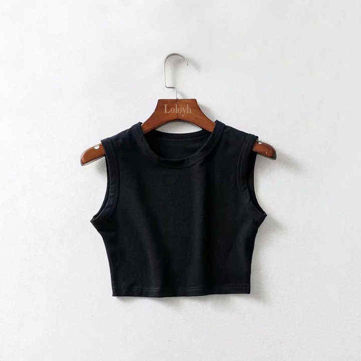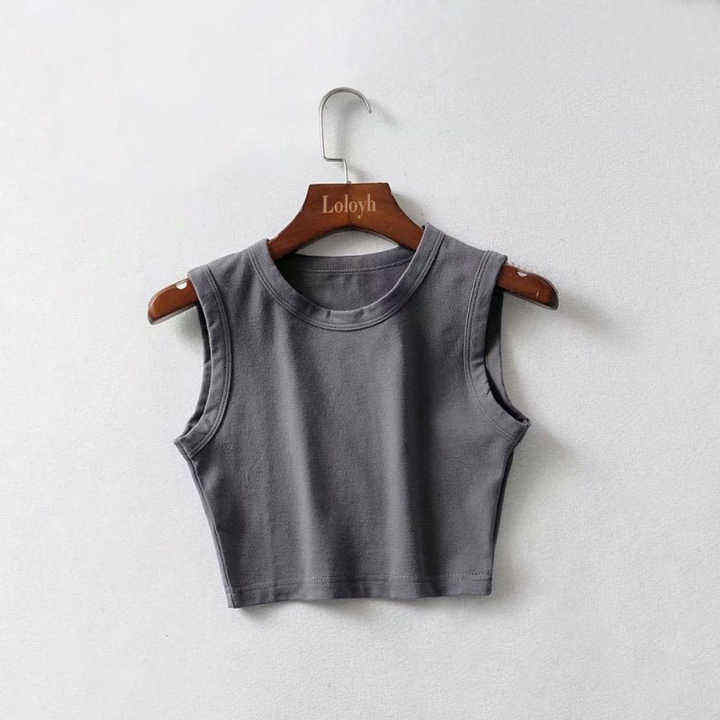 Camiseta recortada barata para mujer, camiseta sin mangas, camiseta sin mangas, ropa de calle sin costuras, blusa elástica de punto básico sin mangas