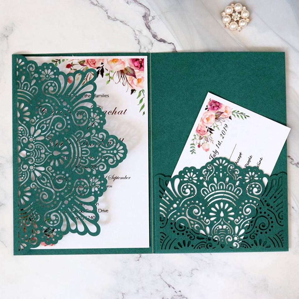 Precio barato de Color púrpura Digital invitaciones de boda corte láser tarjeta de invitación sobres de bolsillo para la apertura de la ceremonia