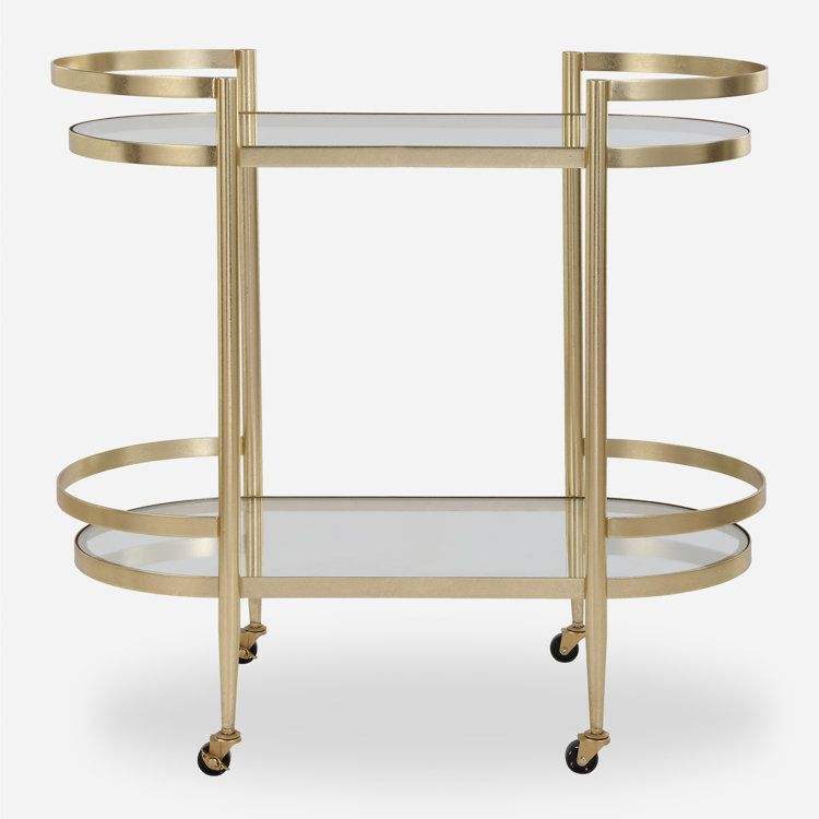 Carrito de servicio de dos niveles de metal elegante y moderno con bandejas de vidrio pulido para uso diario y alojamiento de eventos especiales