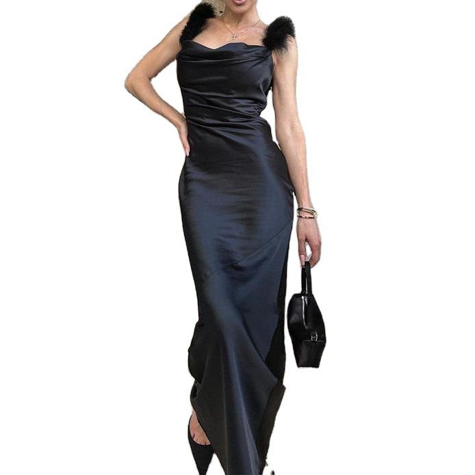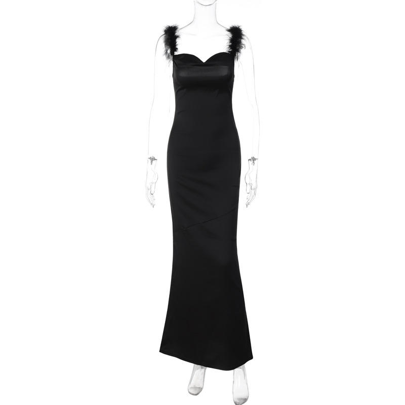 Vestido Maxi Elegante de Noche para Mujer, Diseño Chic, Color Sólido, Tirantes, Espalda Descubierta, Spandex/Poliéster, Plumas, Cintura Natural, Antiestático