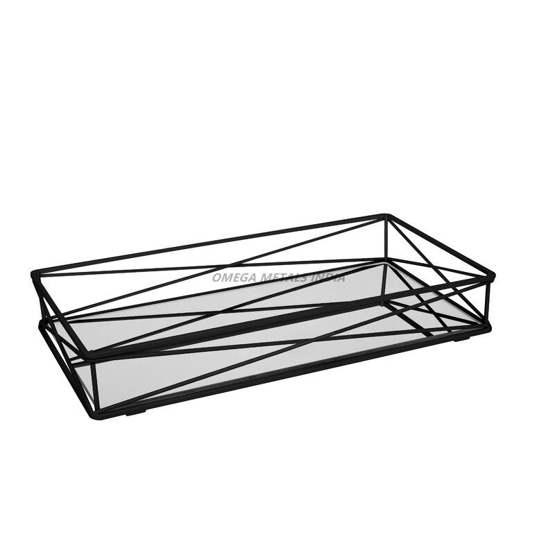 Elegante bandeja de servicio rectangular dorada con base de vidrio y asas elegantes, perfecta para un entretenimiento elegante y acentos para el hogar
