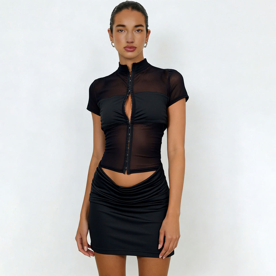 Vestido mini elegante con cuello redondo, botones, aberturas, manga corta, color liso, cintura natural e impresión digital para mujer