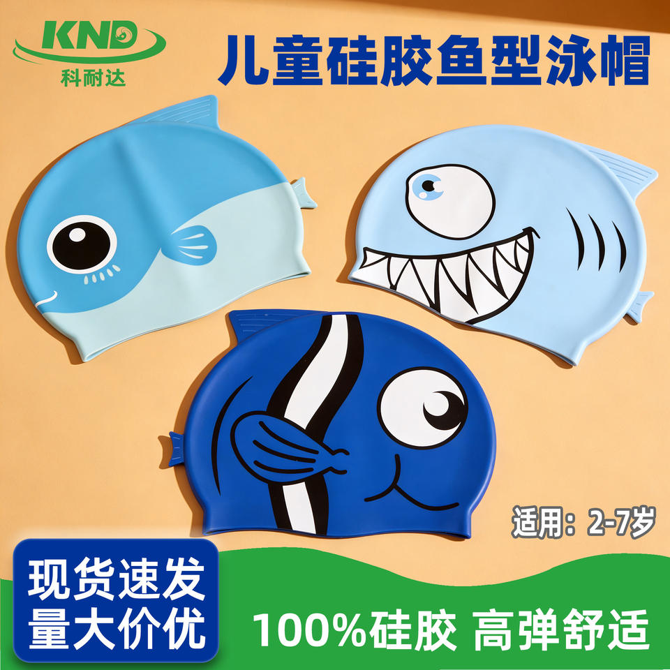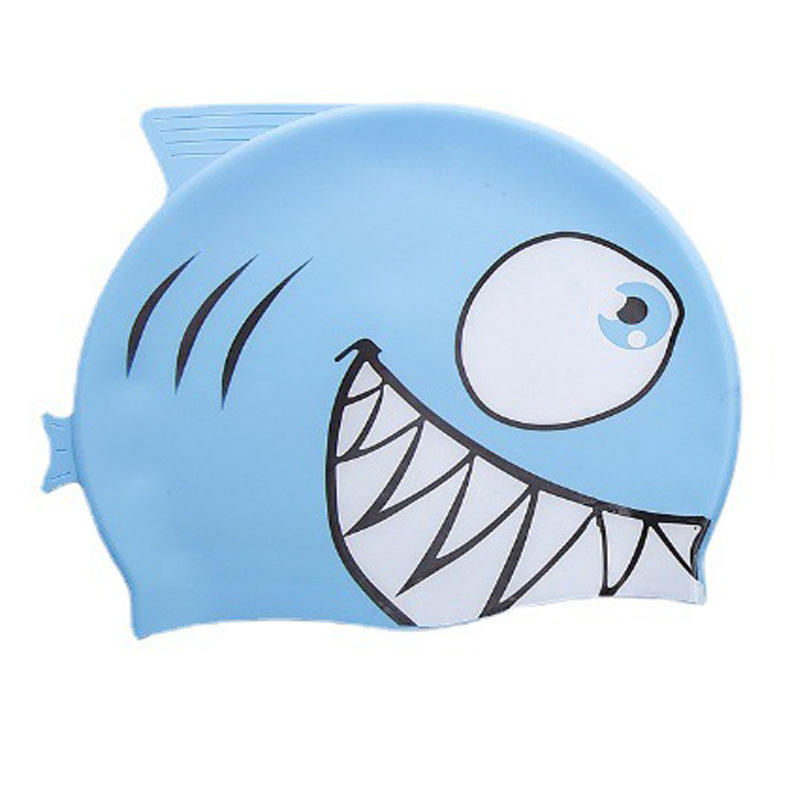 Gorro de natación con forma de pez para niños, protección para los oídos de silicona de color sólido para uso en piscinas para niños