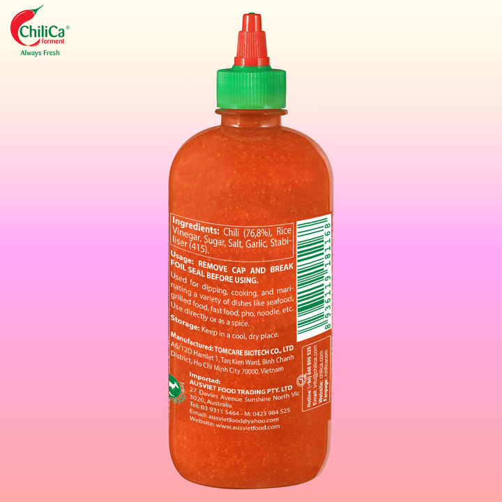 Ingredientes:Chili (76.8%), garlic, rice vinegar, salt, sugar
