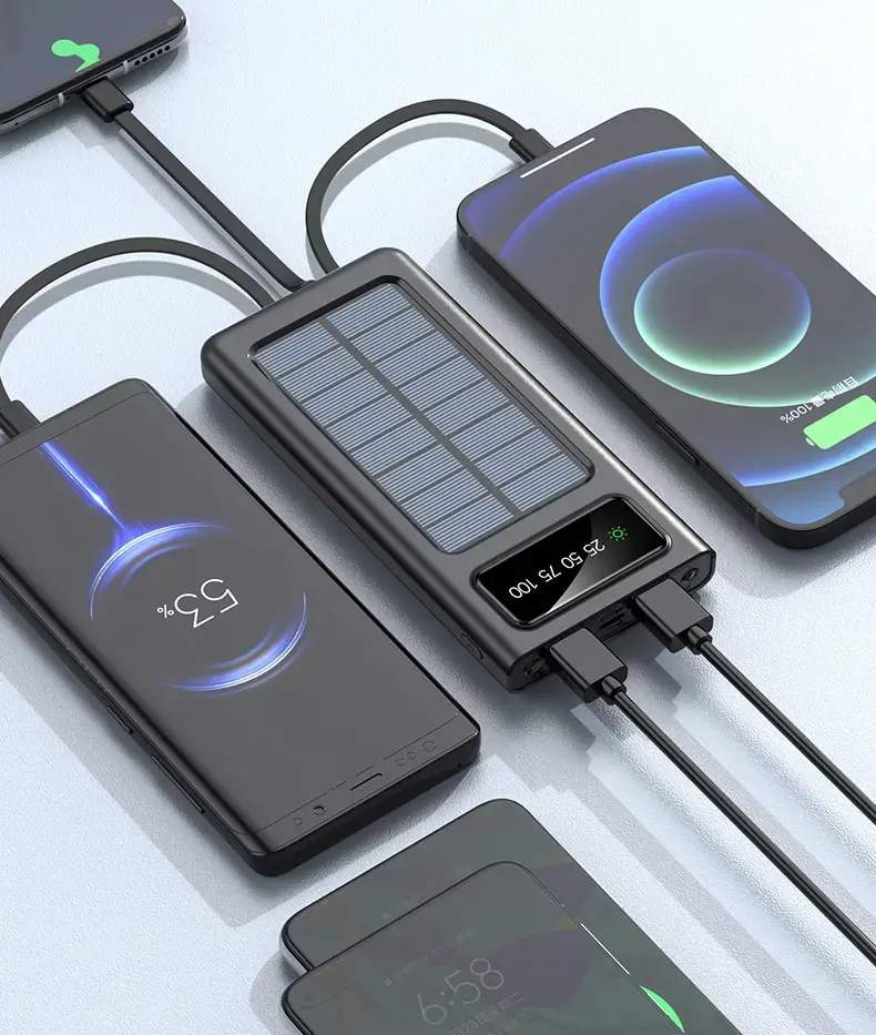 Fábrica China OEM LOGO 4 en 1 cable USB 20000mAh 30000mAh banco de energía solar incorporado 4 cables para iPhone 13 14 15 pro Max