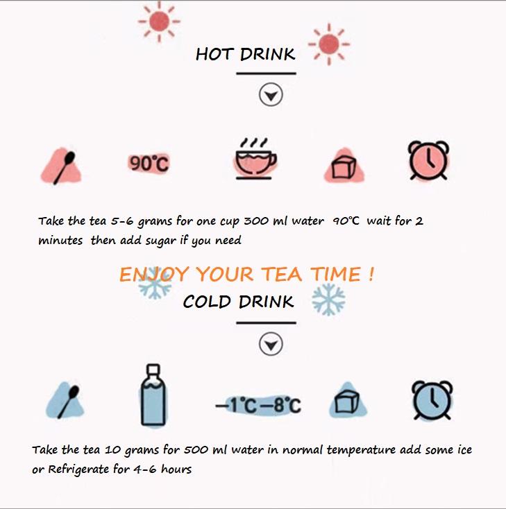 Instrucciones de uso:Brew el té en agua caliente o fría 3 minutos