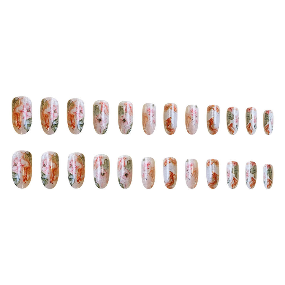 Uñas Postizas con Diseño de Loto y Peces Koi Estilo Chino, Uñas Acrílicas Pintadas a Mano, Reutilizables, Cobertura Completa, para Mujer