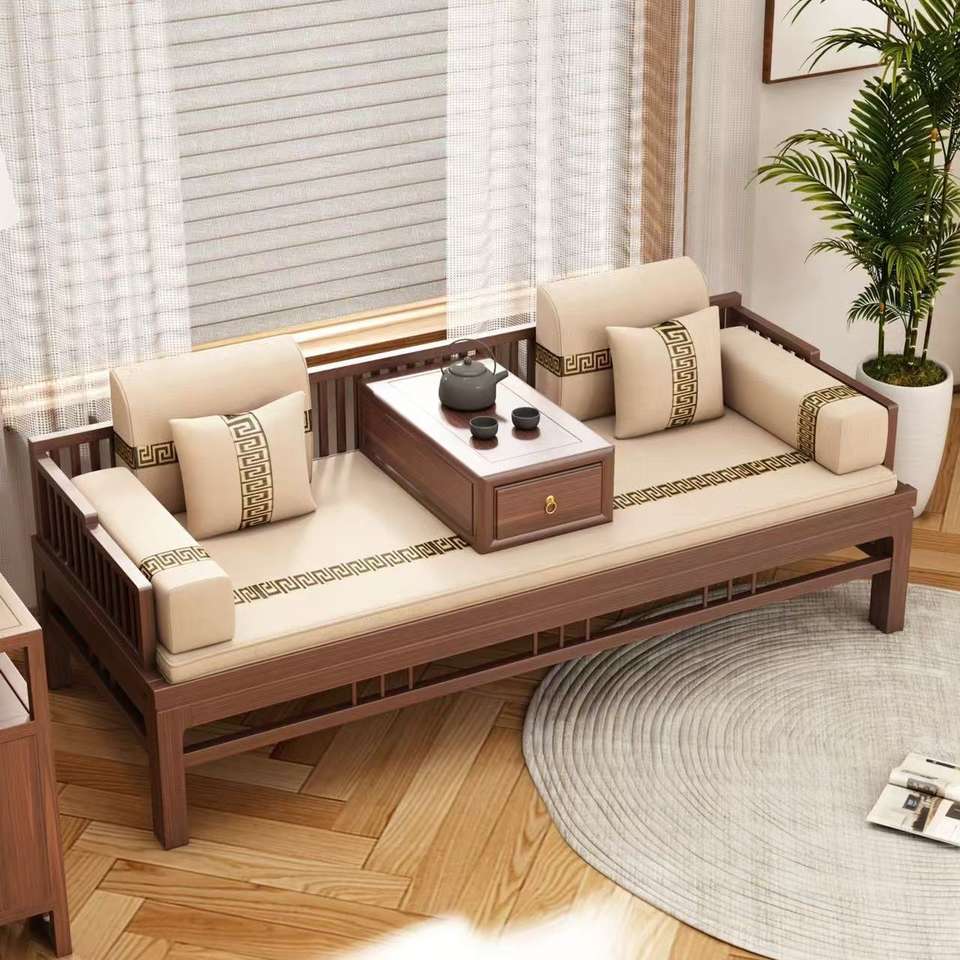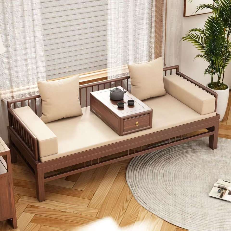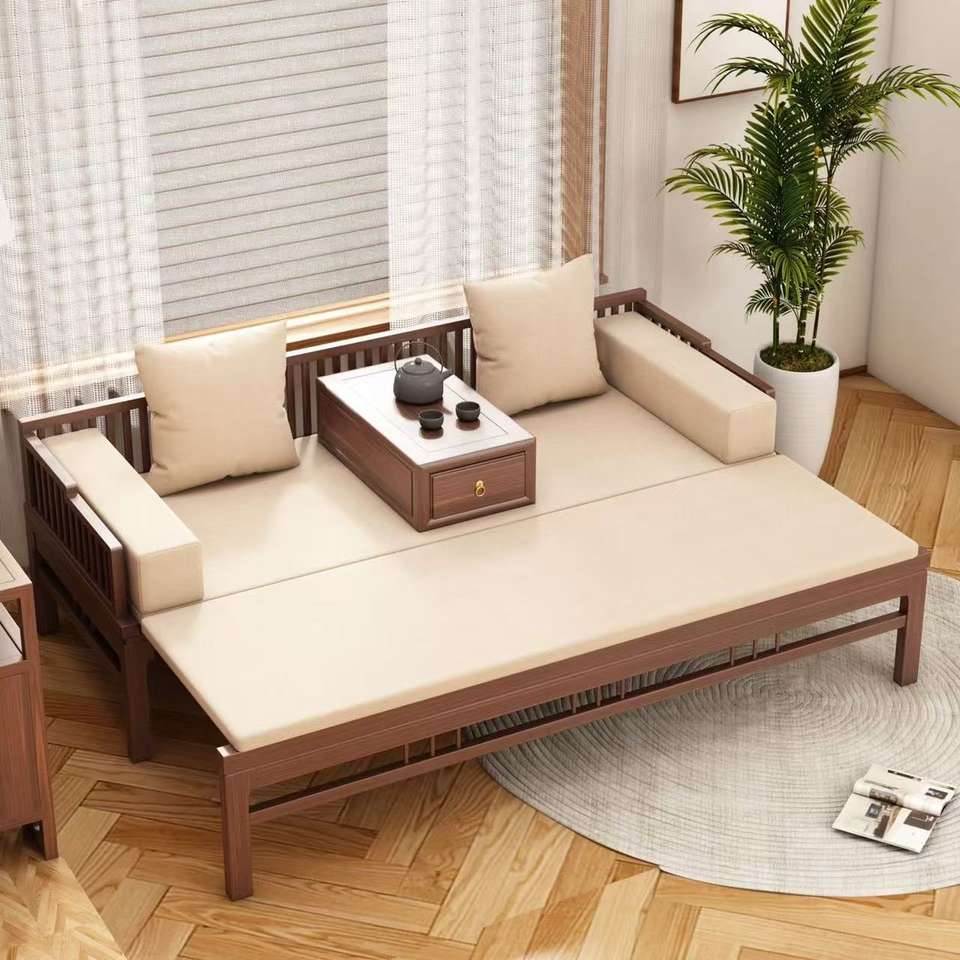 Sofá Cama de Madera Maciza Estilo Chino con Sofá Deslizante Extraíble y Lavable, Madera de Nogal y Olmo, Estilo Zen Moderno Minimalista, Doble Uso