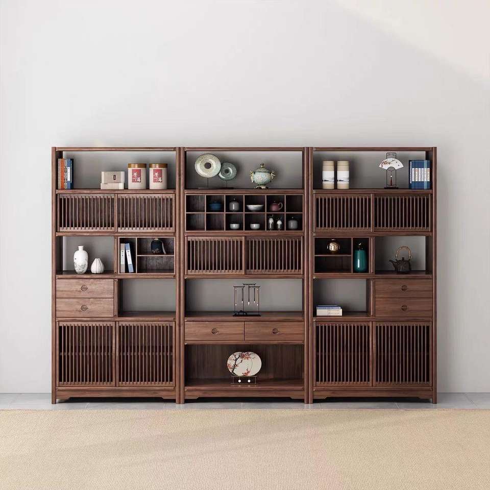 Estante de exhibición de madera maciza de estilo chino, estantería de nogal negro, mueble para té, unidad de almacenamiento múltiple para sala de estar, organización del hogar