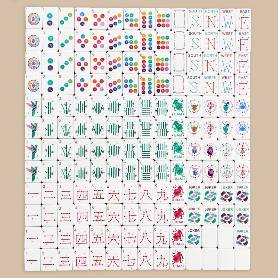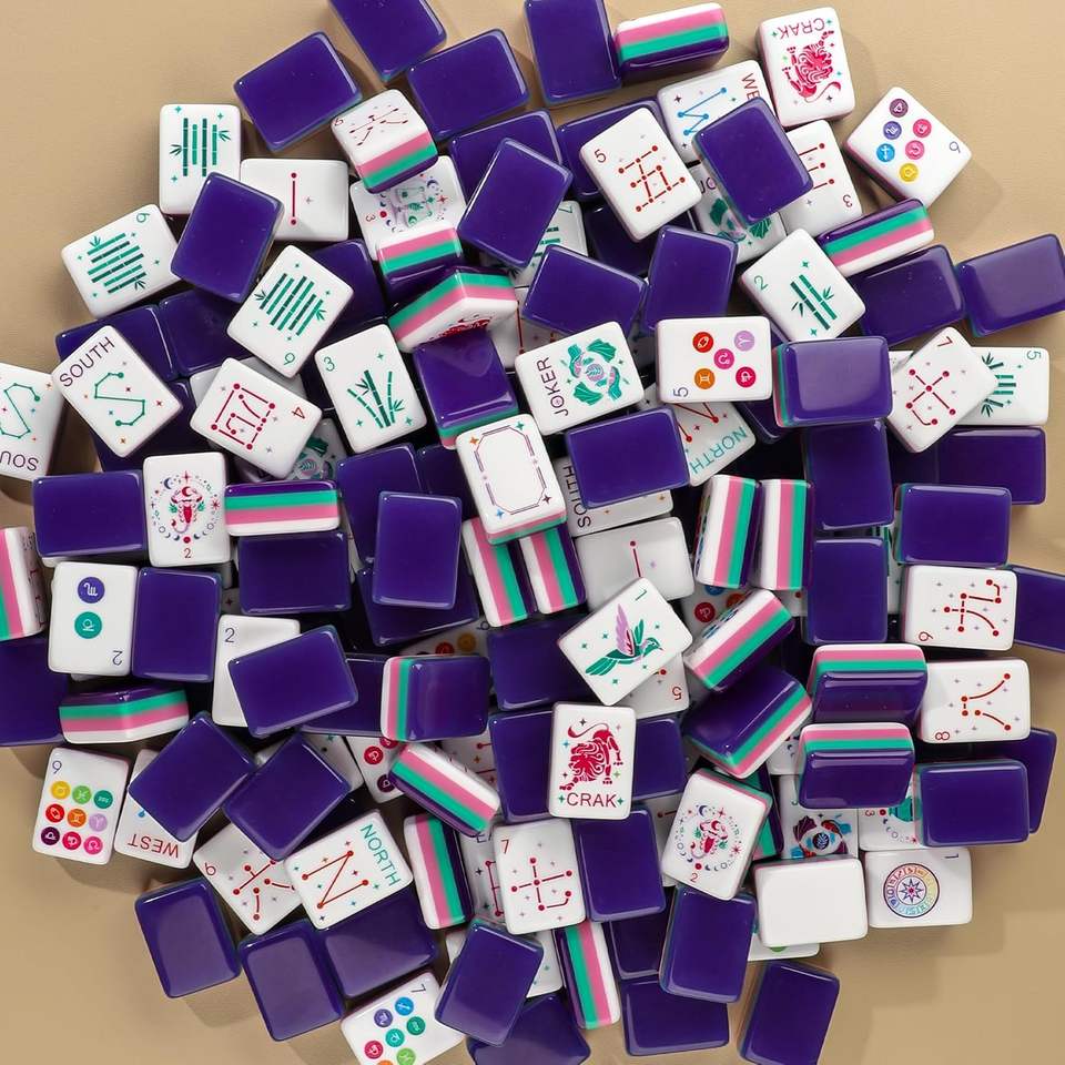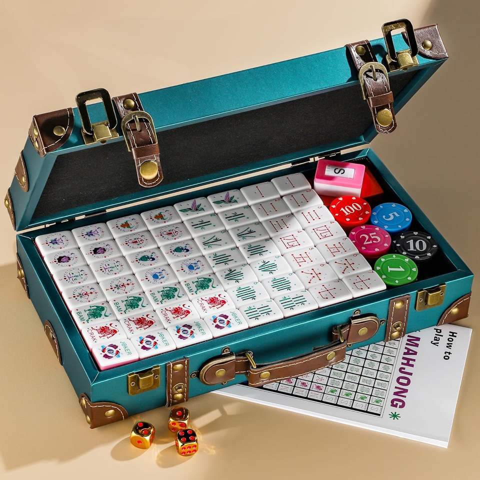 Juego de Mahjong Americano con Diseños del Zodiaco Chino, Fichas Acrílicas Coloridas, Dados Dorados y Estuche de Viaje de Cuero