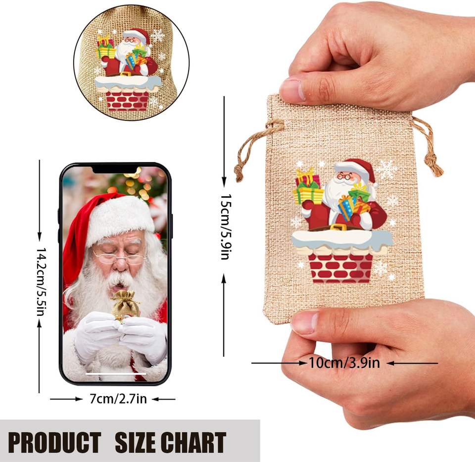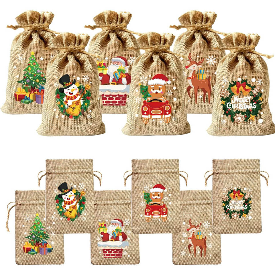 Bolsas con cordón de yute de lino reutilizables, papel de regalo de arpillera de Navidad para dulces, aperitivos, favores de fiesta, envoltura de vacaciones