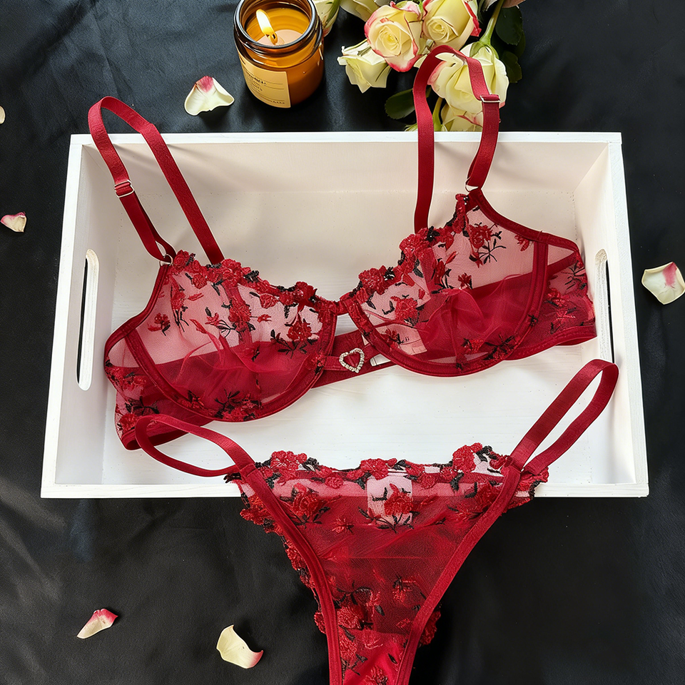 Conjunto de Lencería Sexy Roja de Encaje para Mujer, Promoción Navideña, Brasier y Bragas, Ropa Interior Elegante, Idea de Regalo Navideño