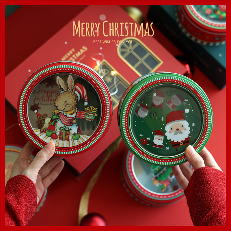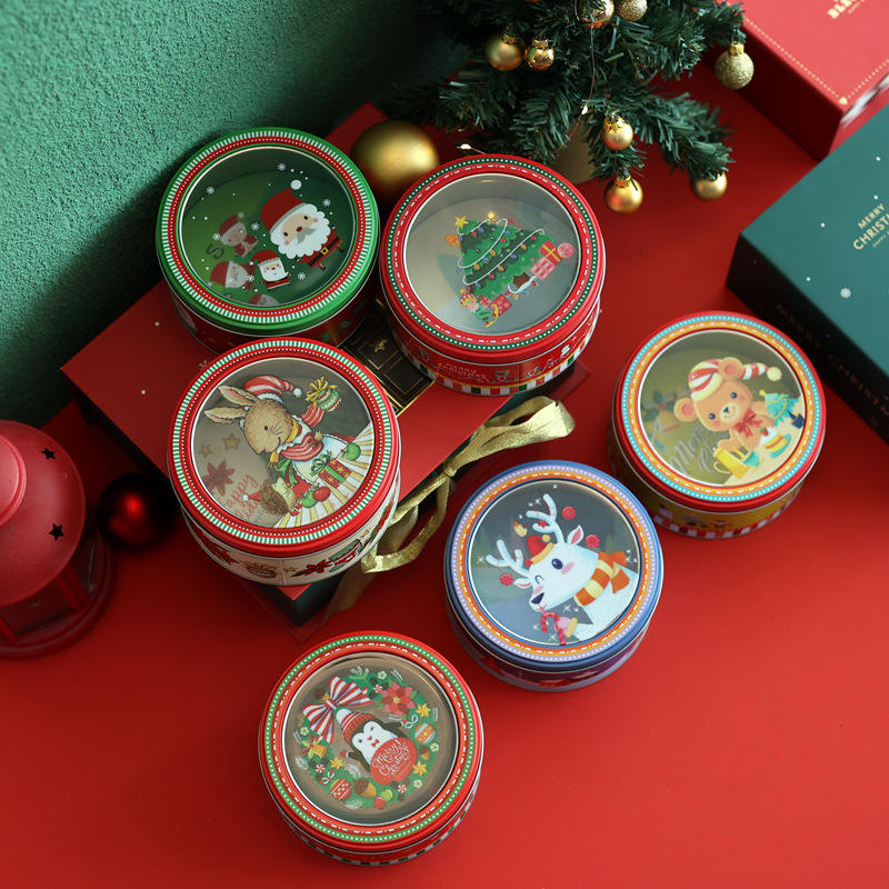 Navidad ventana transparente lata redonda dibujos animados Santa Claus caja de hojalata impresa Navidad caramelo fondant galleta hornear caja de embalaje