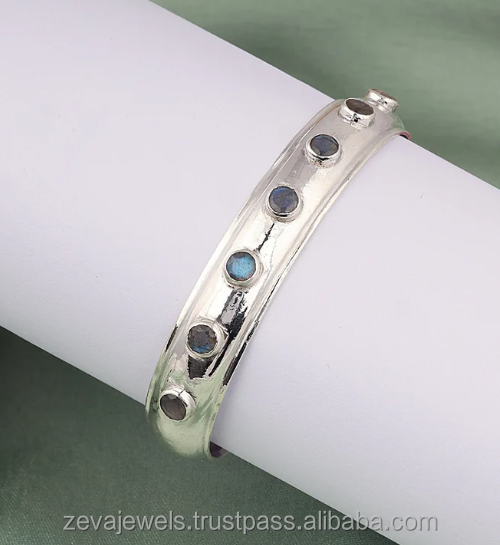 Brazalete ajustable de plata esterlina gruesa Conjunto de piedra de labradorita redonda Brazalete unisex