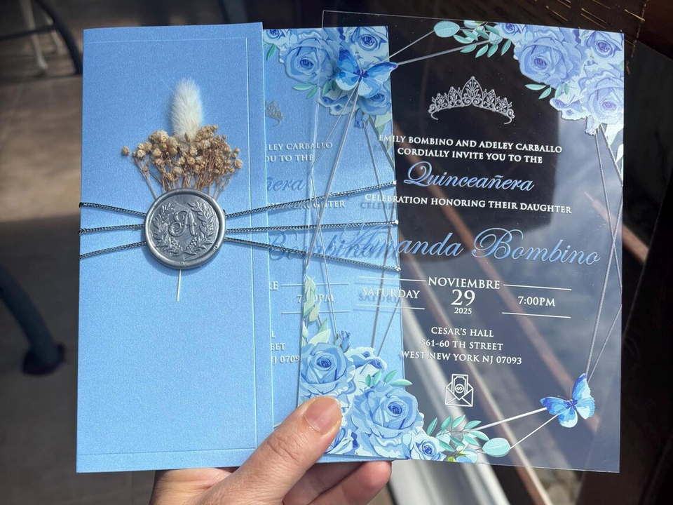 estilos:Tarjeta acrílica + caja de terciopelo + borlas