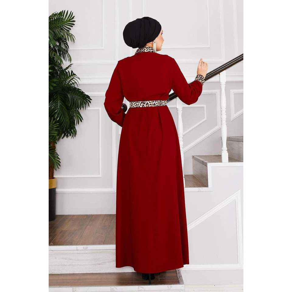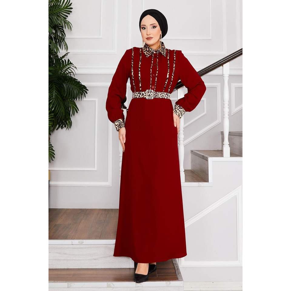 Vestido Hijab con cuello de camisa con patrón de leopardo rojo clarete para mujer elegante Formal viscosa XL sostenible y ecológico