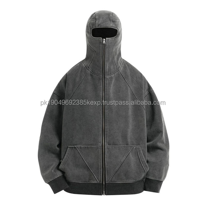 Sudadera Clásica con Capucha Balaclava para Hombre, Gris Lavado, Estilo Hip Hop, Vintage, Primavera, Streetwear