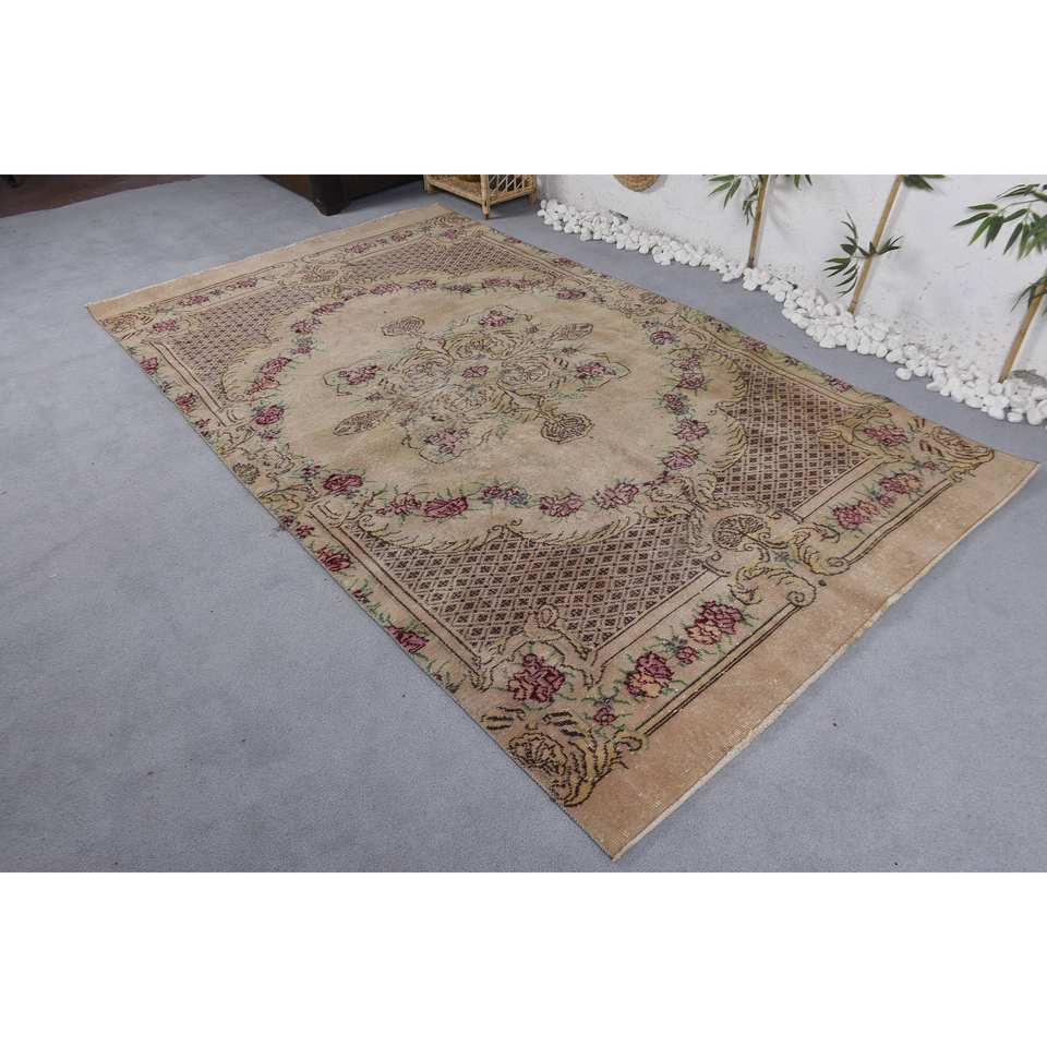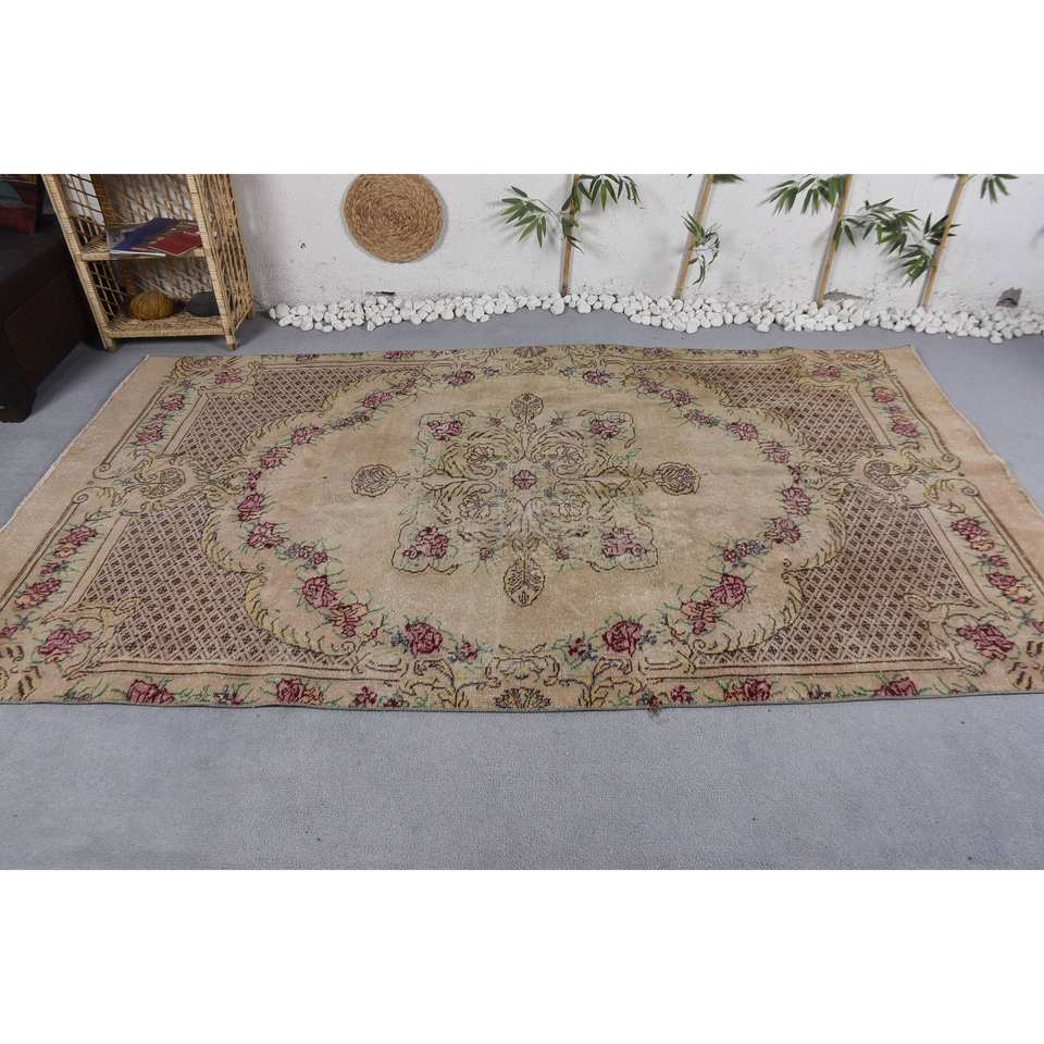 Alfombra KayraHome Clásica Beige Vintage de Lana Turca Ecológica de Pelo Medio, 5.2 x 9.1 pies, Diseño de Tejido Plano con Parches, para Comedor