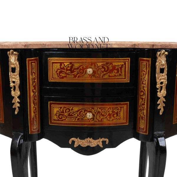 Mesa Consola Clásica de Madera Negra con Dos Cajones, Tapa de Mármol, Patas Curvas, Adornos de Latón e Incrustaciones Decorativas
