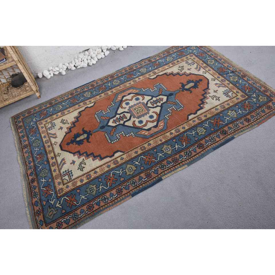 Alfombra clásica de lana marrón y azul, diseño de retazos de 3,8x6 pies, respaldo de látex, alfombra rectangular abstracta esponjosa para sala de estar, pasillo