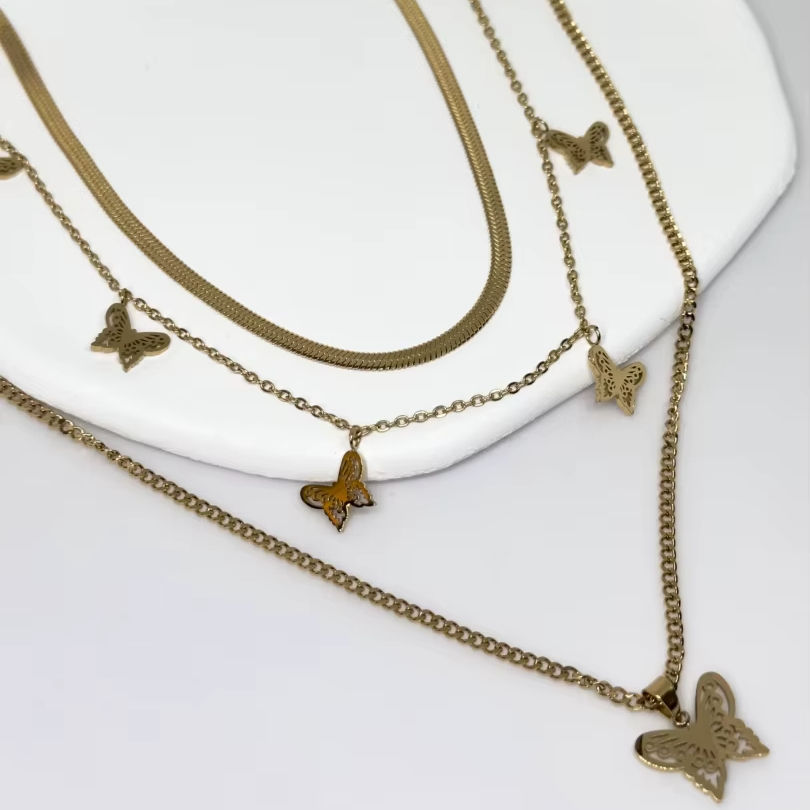 Elegante patrón geométrico oro rodio plateado cadena de eslabones mariposa clásica Triple cuentas collar elegante fiesta acero inoxidable