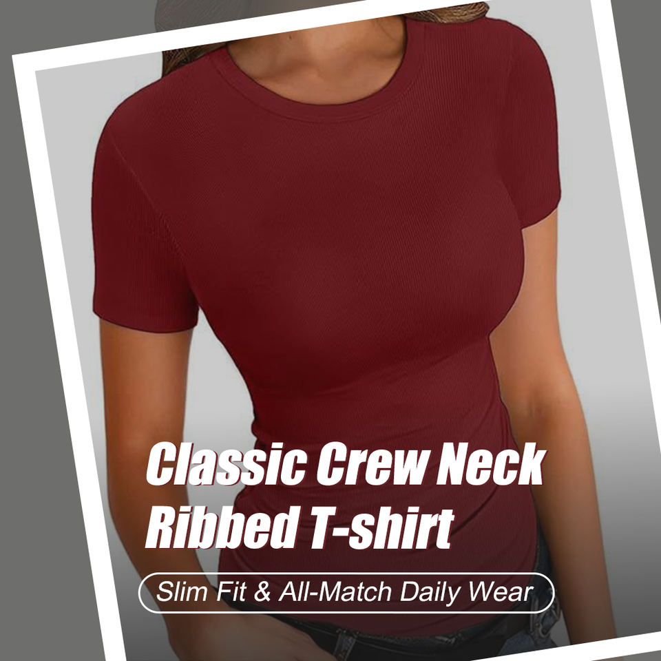 Camiseta Clásica de Cuello Redondo y Canalé para Mujer, Manga Corta, Corte Ajustado, Tops Básicos para Uso Diario Informal