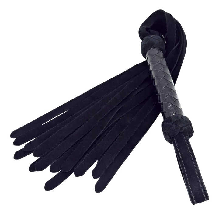 Flogger Clásico con Colas de Gamuza Negra y Mango Trenzado Negro, Látigo de Cuero Premium Hecho a Mano para Juegos de Impacto