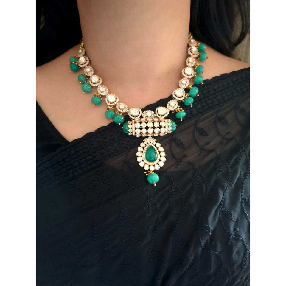 Conjunto de Joyería Nupcial Clásica Chapada en Oro, Collar Kundan Polki Color Champán con Cuentas de Calabaza Esmeralda y Diamantes para Fiestas