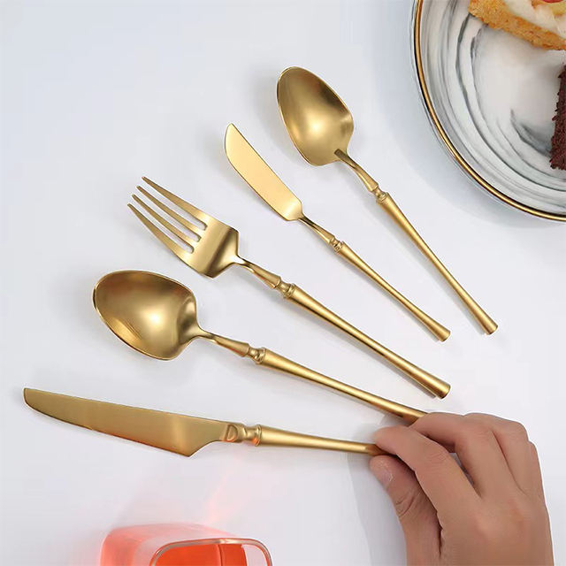 Cubiertos clásicos de acero inoxidable 304 con diseño de mango creativo pulido mate de alta gama, cuchara y tenedor, cubiertos dorados para boda para arrendamiento