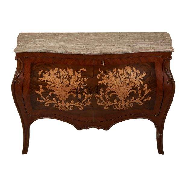 Consola Clásica de Madera con Incrustaciones, Tapa de Mármol y Motivos Florales, Elegante Consola de Almacenamiento de Lujo para Sala de Estar
