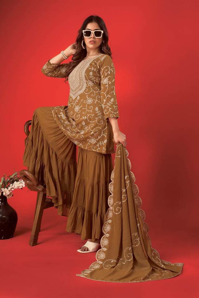Nuevo patrón clásico bordado a mano estilo cachemir Color brillante Georgette tela Top y Sharara con Dupatta Set de Surat