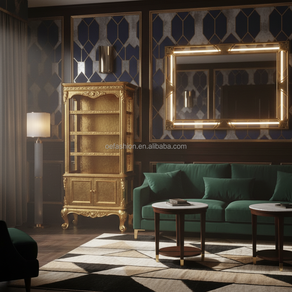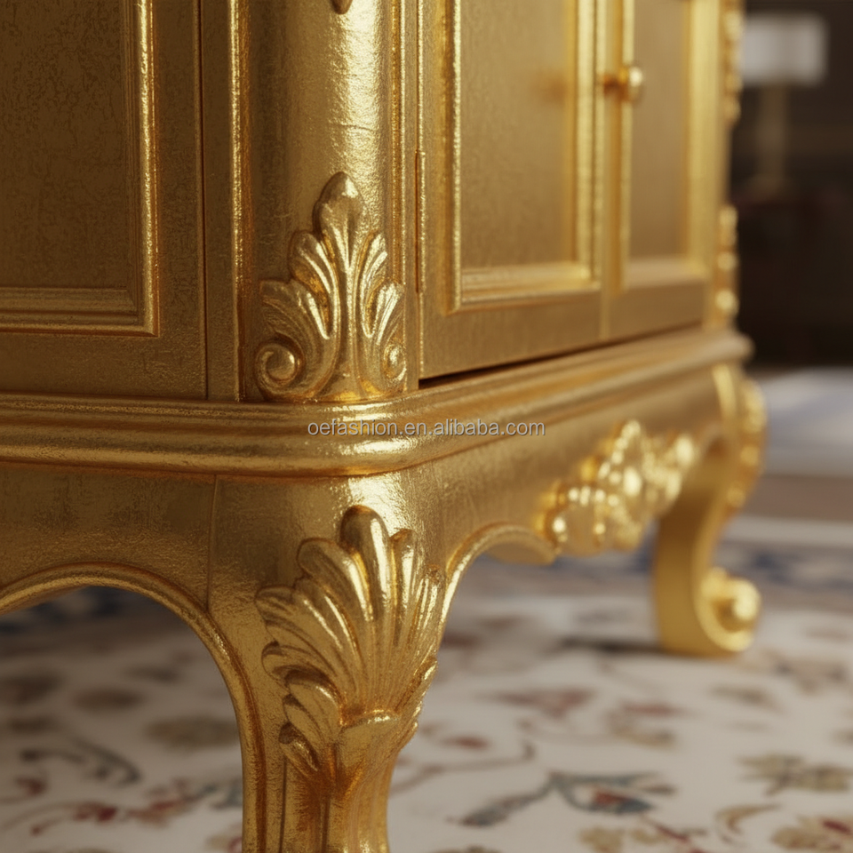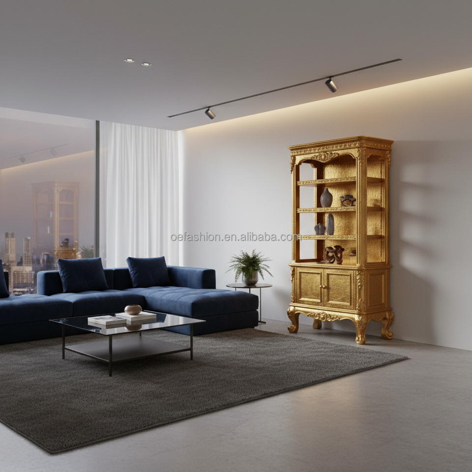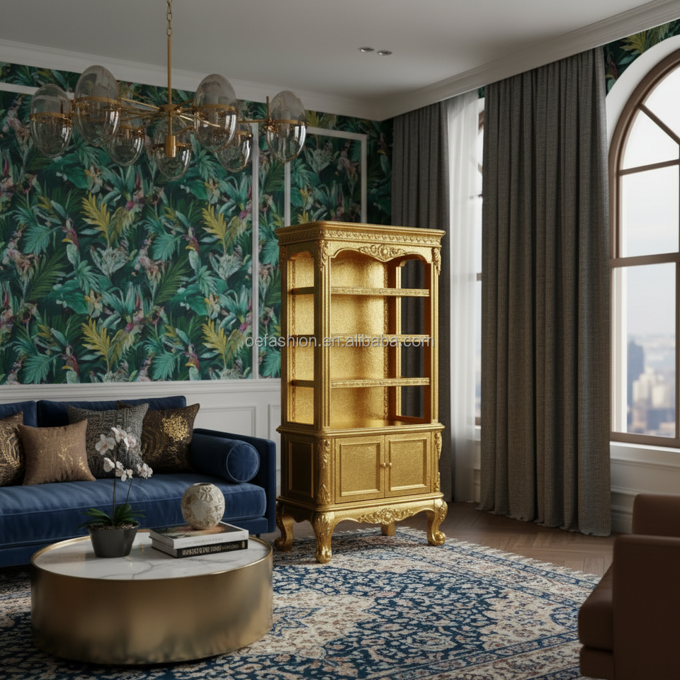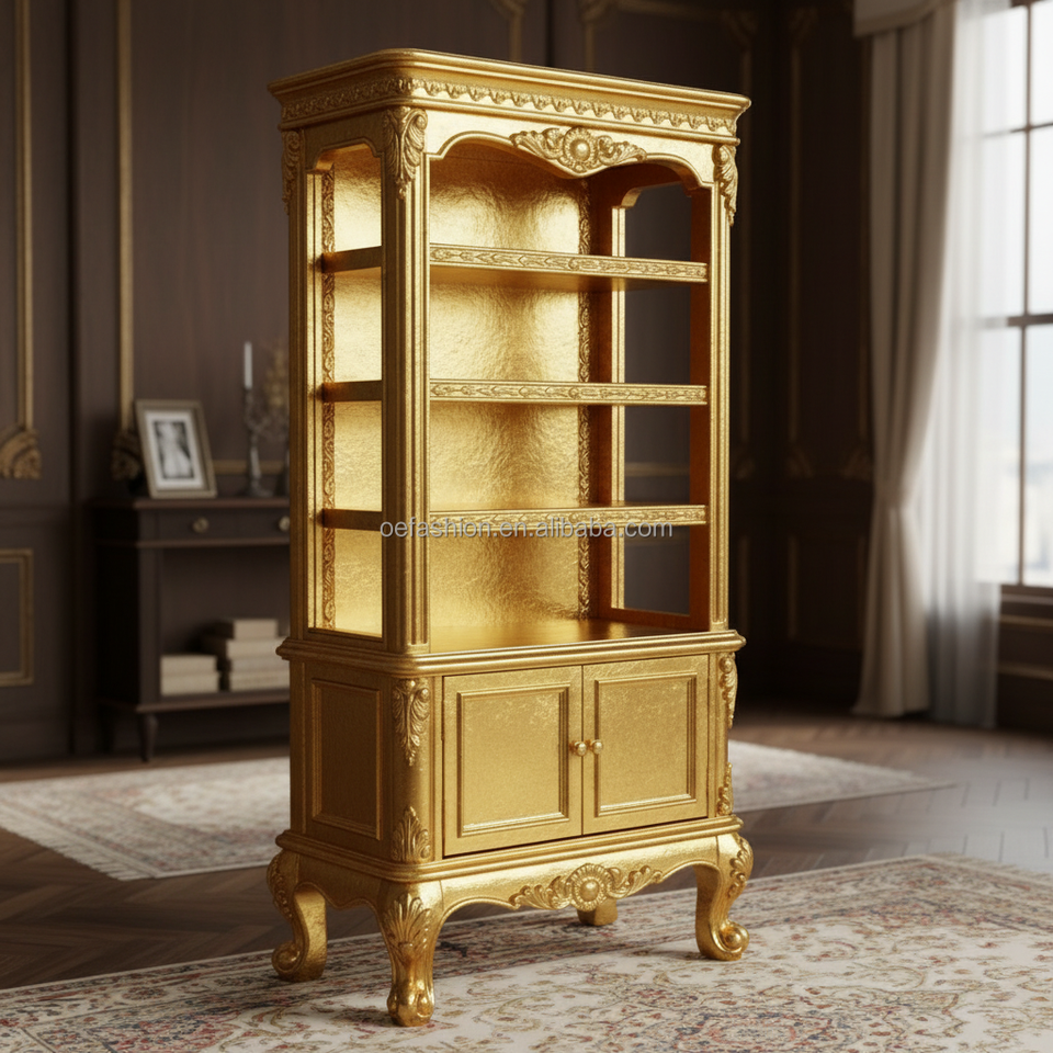 Librería Abierta Clásica Rococó Tallada a Mano y Dorada con Puertas de Almacenamiento y Patas Cabriolé para Sala de Estar