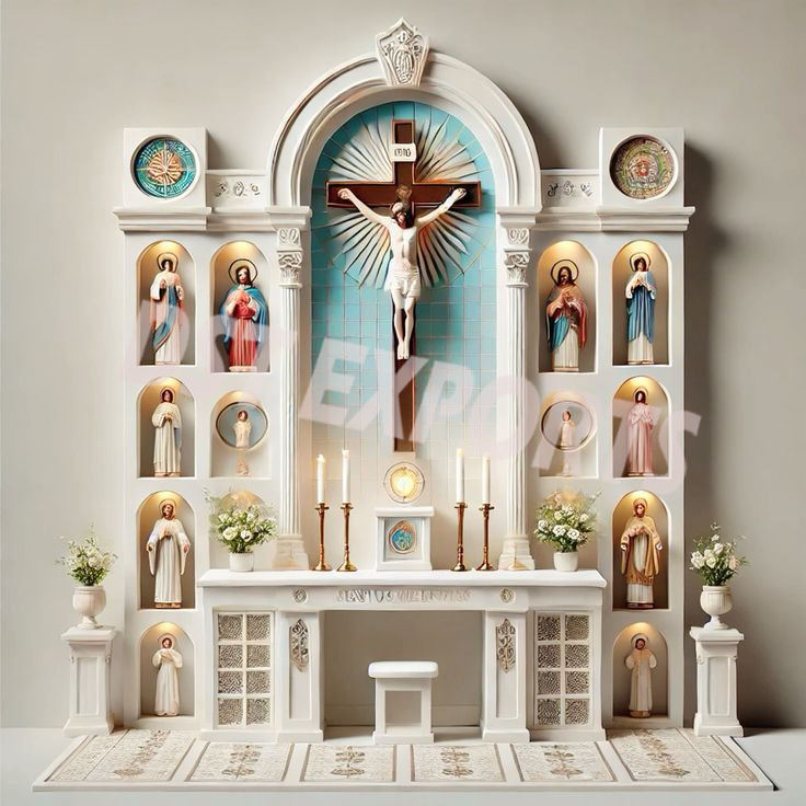 Altar de madera tradicional de estilo romano clásico con detalles dorados, diseño desmontable, majestuoso arco de altar de iglesia de madera de teca de oro blanco