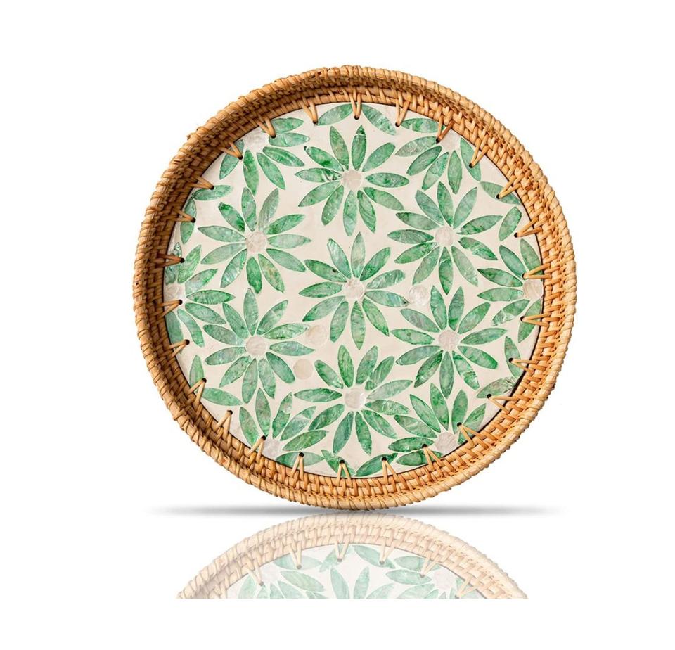 Bandeja de servicio de ratán redonda clásica con mesa Base de madera, bandeja decorativa para servir alimentos, almacenamiento y exhibición, bandeja de mesa de café