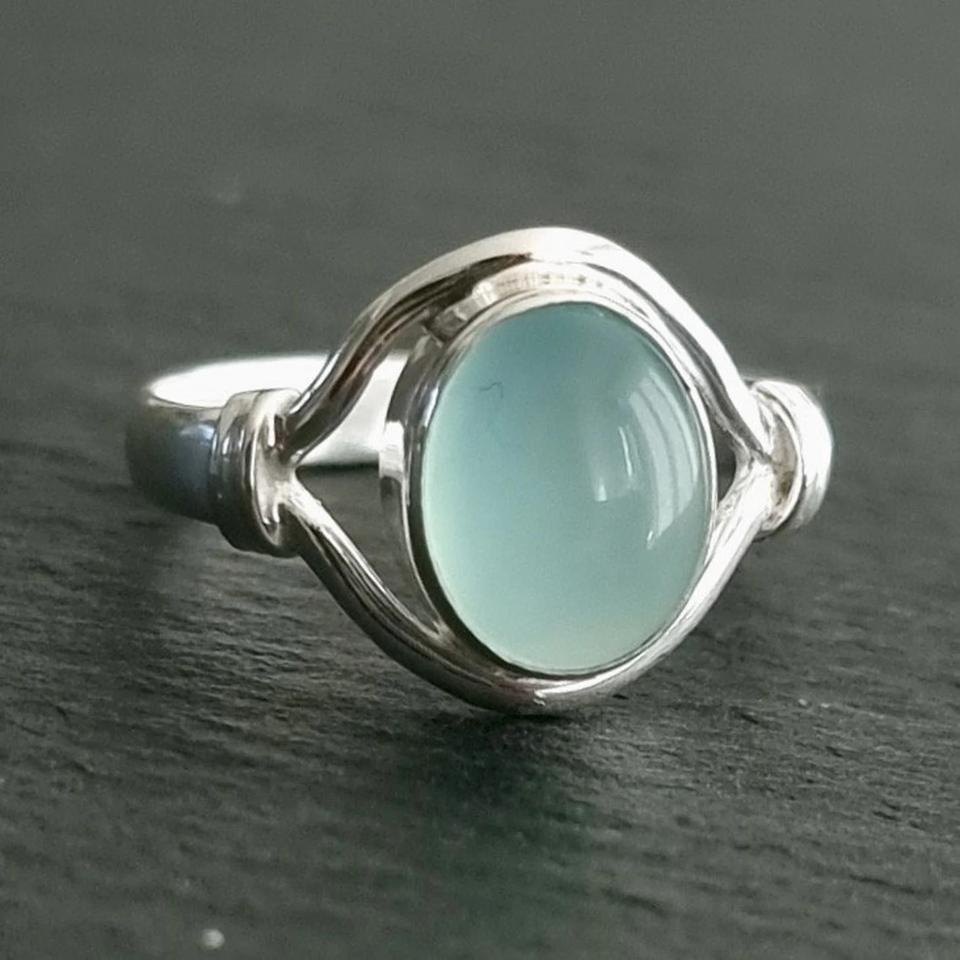 Anillo hecho a mano de Calcedonia azul de estilo clásico, ajuste de bisel de piedras preciosas de corte ovalado, regalo de boda de aniversario perfecto para ella