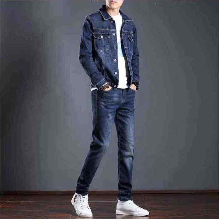Classic Washed Stretch Casual Slim Fit Denim Set Jeans para hombre y chaqueta de jeans