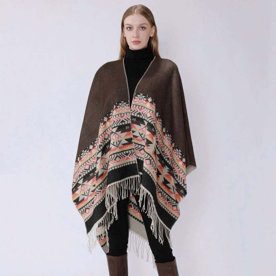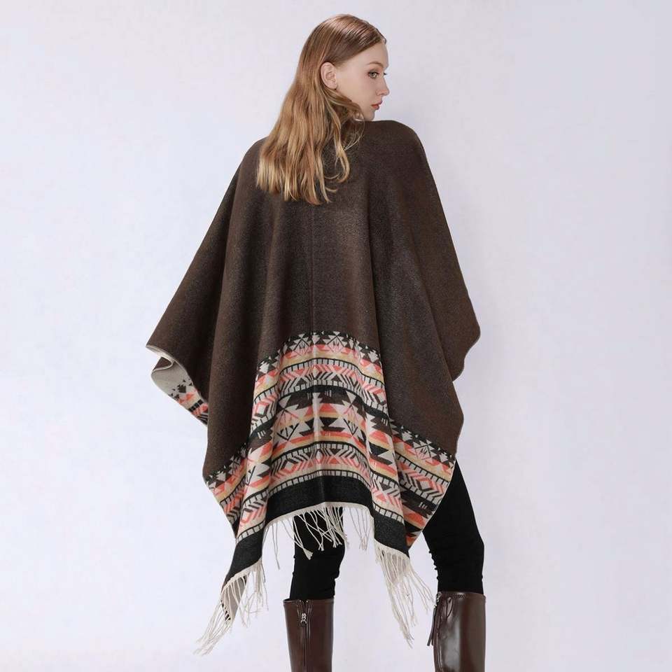 Poncho clásico de invierno cálido, largo, con capucha y frente abierto, estilo chal, con borlas, capa mexicana de acrílico para mujer, material de lana, estilo disfraz.