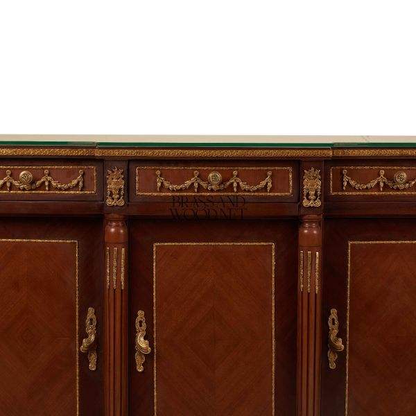 Consola Clásica de Madera con Tapa de Mármol y Diseño de Tres Puertas, Detalles Decorativos de Latón, Consola de Almacenamiento de Lujo