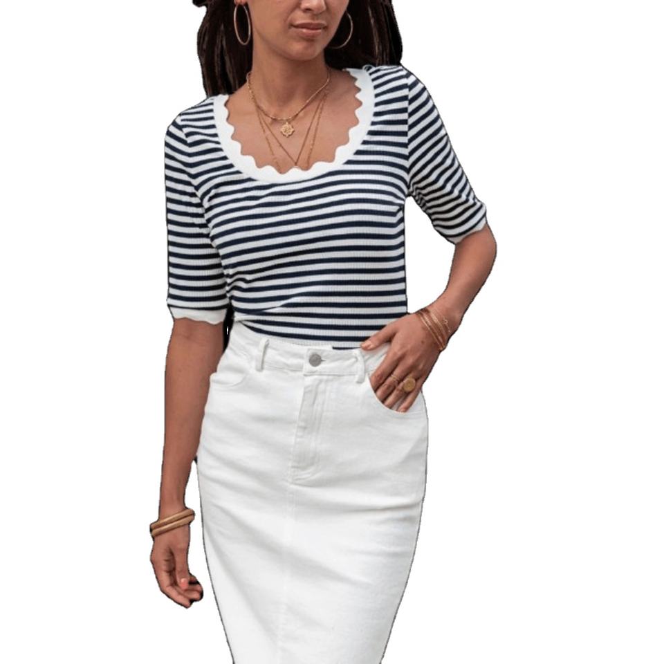 Product name:Black Striped Contrast Scallop Trim Half Sleeve T-Shirt