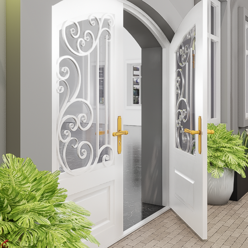 Puerta doble de hierro clásica para la entrada de la casa con pergaminos vintage y vidrio templado construido para impresionar y proteger con elegancia
