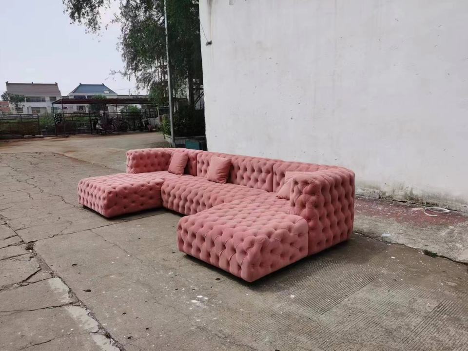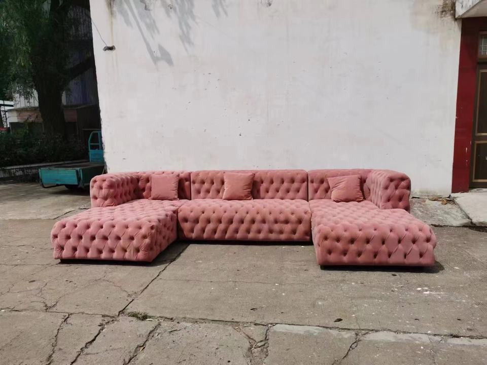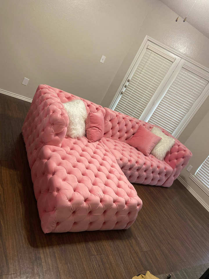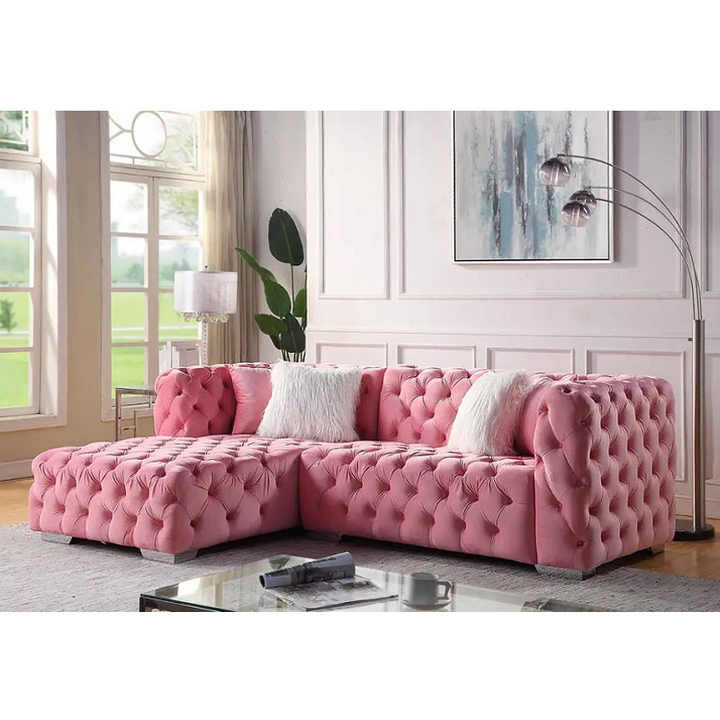 Sofá Seccional en Forma de L, Tapizado en Terciopelo Rosa, Estilo Rústico Clásico, con Botones Decorativos, para Sala de Estar