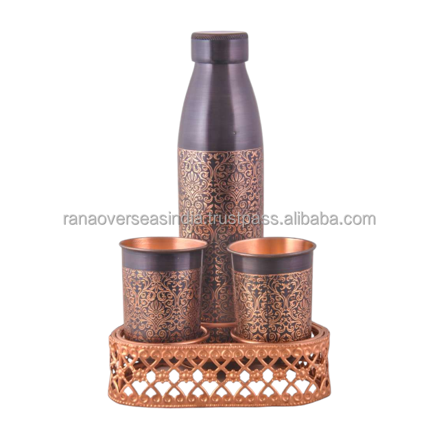 Juego de botellas de agua de cobre puro con diseño Floral elegante, a prueba de fugas, acabado antiguo con dos vasos, sin Bpa a un precio asequible