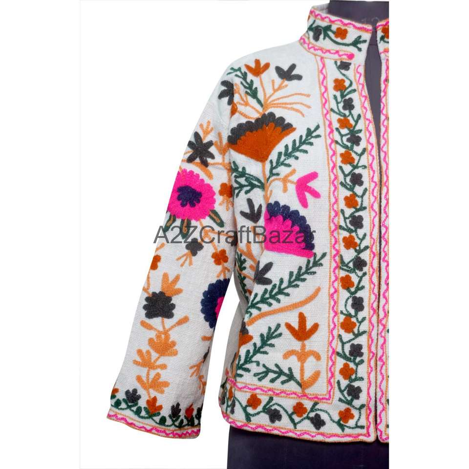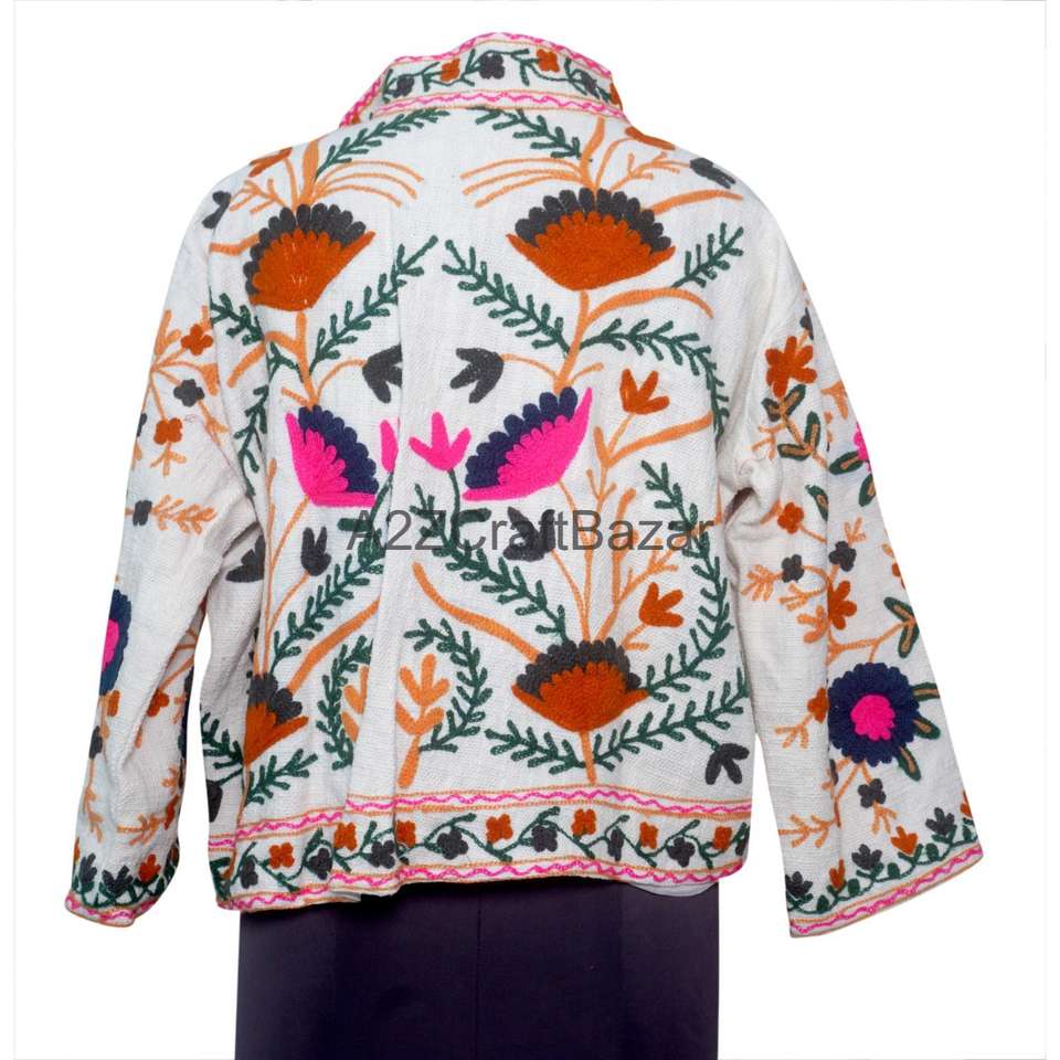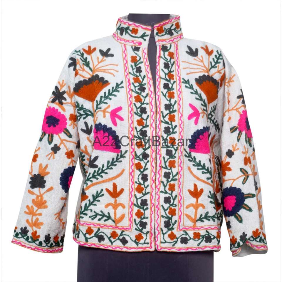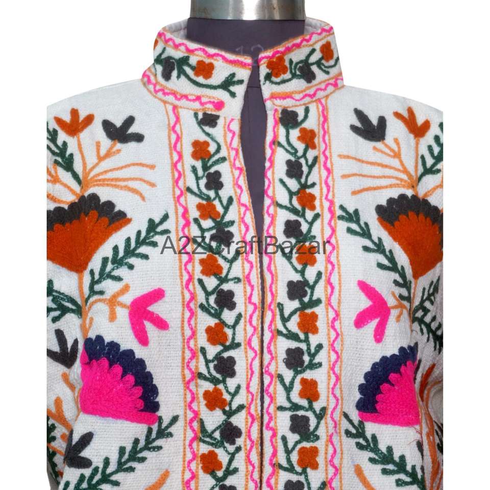 Chaqueta de punto floral elegante con volantes bordados, transpirable, ecológica, de invierno, hecha a mano en India, estilo Suzani, de algodón TNT, con cuello en V.