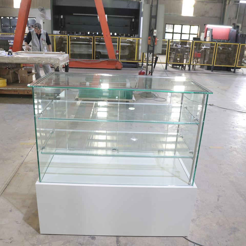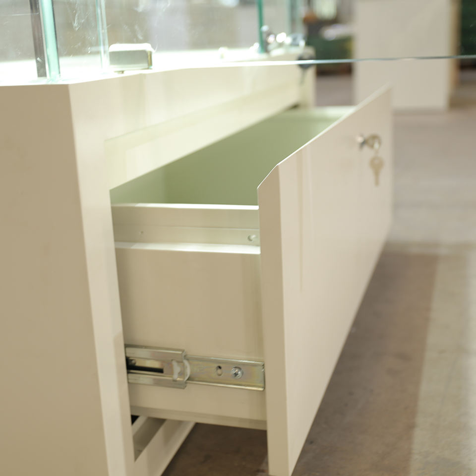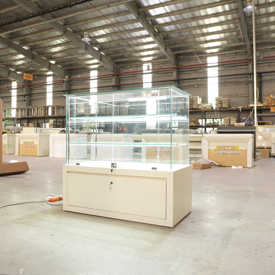 Vitrina de mostrador Clean Fit con espejo, mesa de exhibición de metal con acabado espejo, vitrina de joyería dorada y blanca para minoristas | Servicio OEM