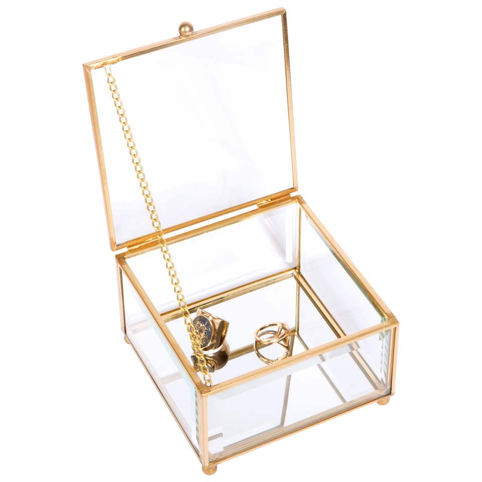 Joyero de cristal transparente con tapa de joyero, tocador, exhibición de joyería de latón de Metal Vintage, Mini caja de anillo, forma cuadrada, Color dorado