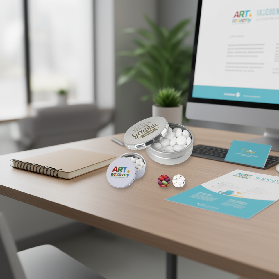 Lata de Dulces Promocional Click Clack 45 con Logotipo Personalizado para Uso de Marca y Marketing, Italia AL107, Etiqueta Blanca, Satinado, Forma Libre