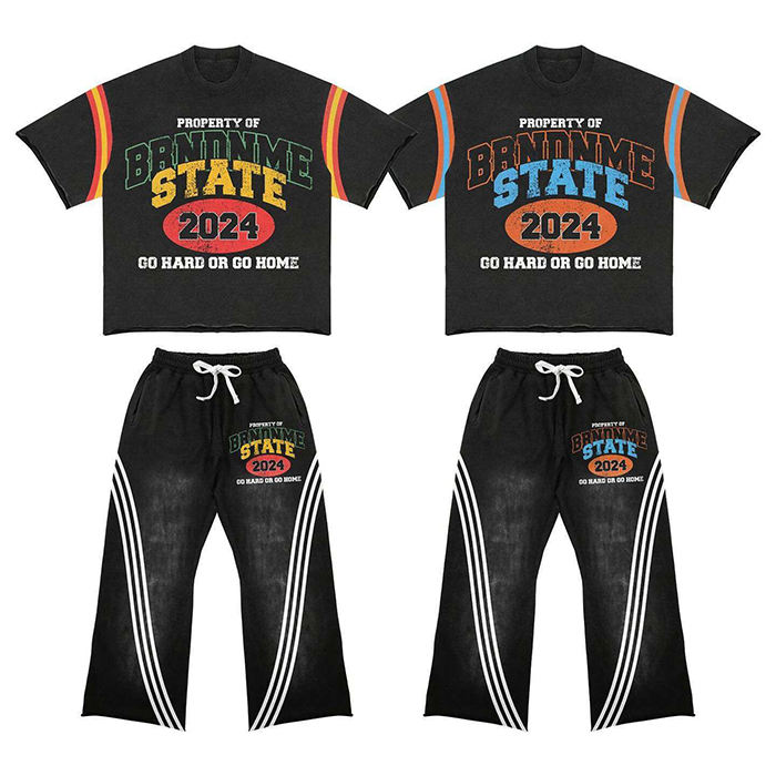 Fabricante Ropa de ropa de calle personalizada Verano Jogging Vintage Lavado con ácido 100% Algodón Camiseta y pantalón acampanado Conjunto
