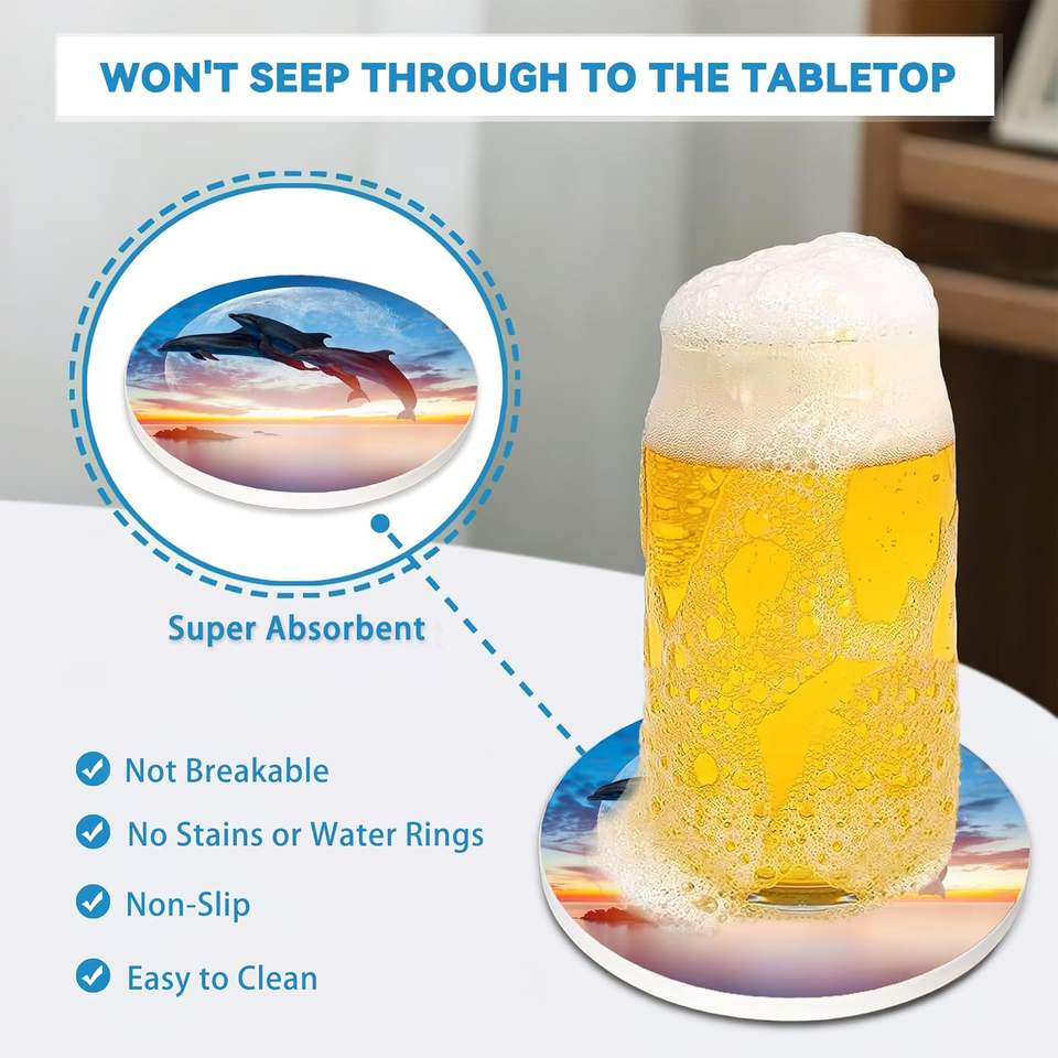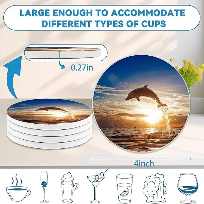 Posavasos Antideslizantes de Corcho y Cerámica Ecológicos con Diseño de Delfines al Atardecer Costero para Decoración de Casas de Playa, Hoteles y Ambientes Temáticos Marinos